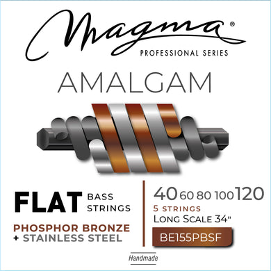 Magma Electric Bass Strings Light- AMALGAM Phosphor Bronze/Stainless Steel FLAT Wound- Long Scale 34" 5 Strings Set, .040 - .125 (BE155PBSF) 1 Set