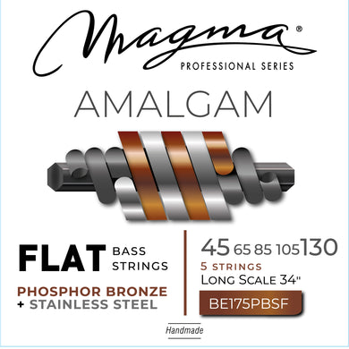 Magma Electric Bass Strings Medium - AMALGAM Phosphor Bronze/Stainless Steel FLAT Wound- Long Scale 34" 5 Strings Set, .045 - .130 (BE175PBSF) 1 Set